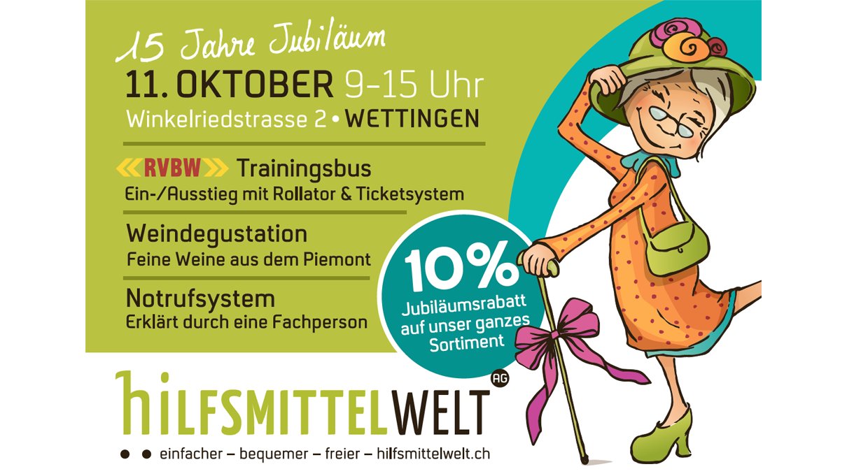 Seit 15 Jahren unterstützt die Hilfsmittelwelt Wettingen Menschen dabei, den Alltag selbständiger und leichter zu gestalten. Zu diesem besonderen Jubiläum gratulieren wir herzlich – und freuen uns, Teil des Festes zu sein.